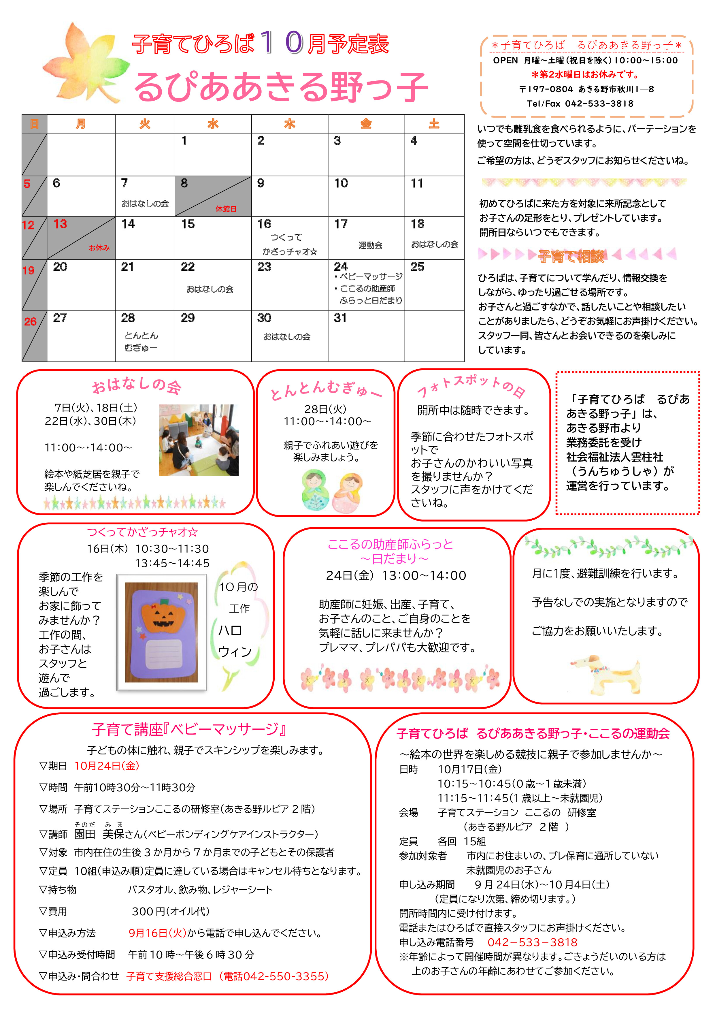 「子育てひろば るぴああきる野っ子」の10月の活動予定表を掲載しました。