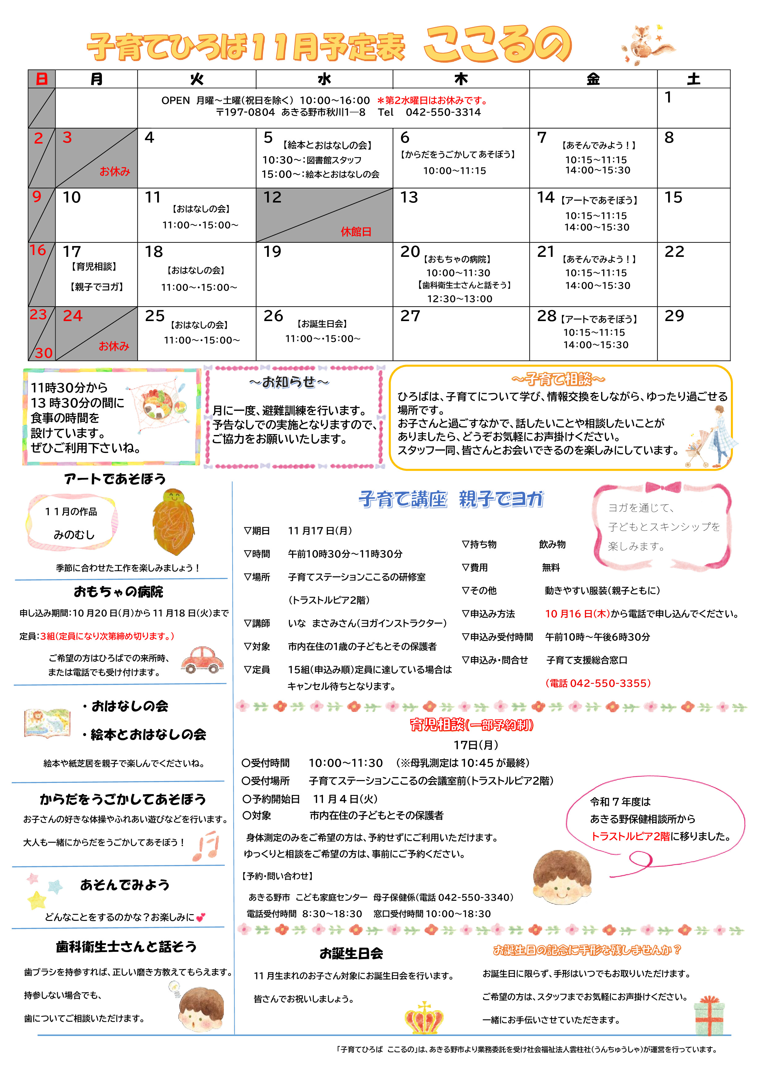 「子育てひろば ここるの」の11月の活動予定表を掲載しました。