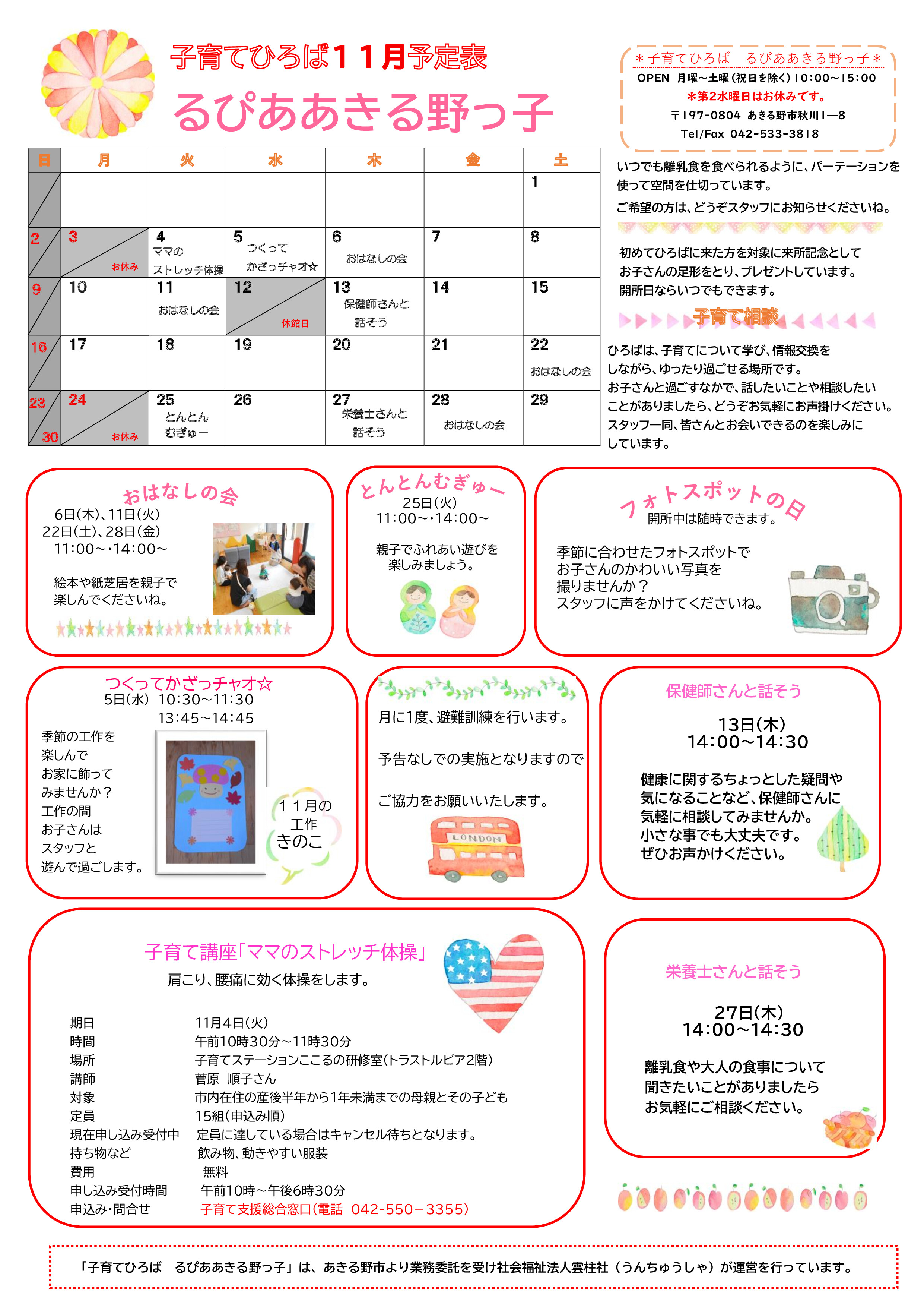 子育てひろば るぴああきる野っ子 11月の活動予定