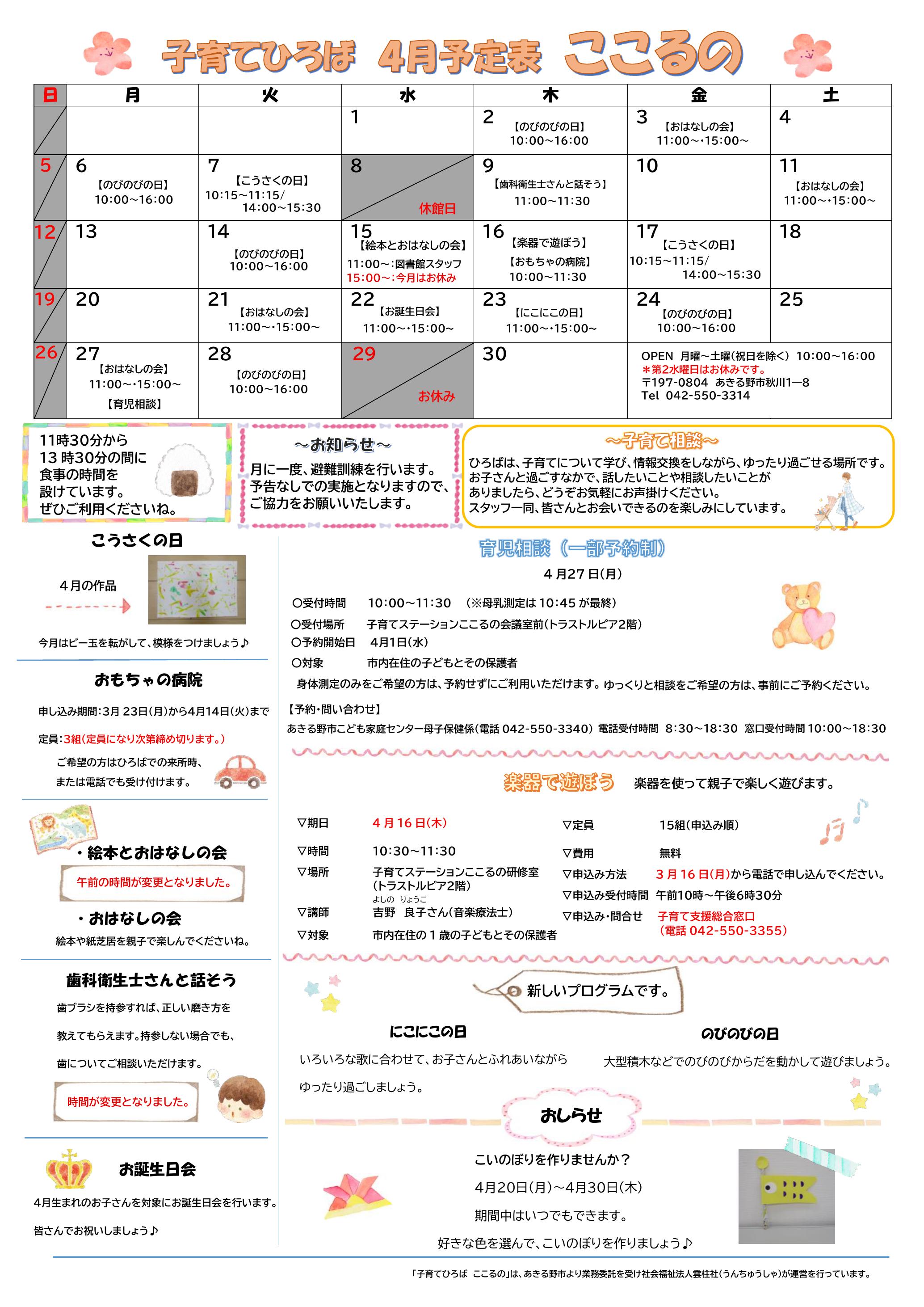 子育てひろばここるの令和8年4月の活動予定