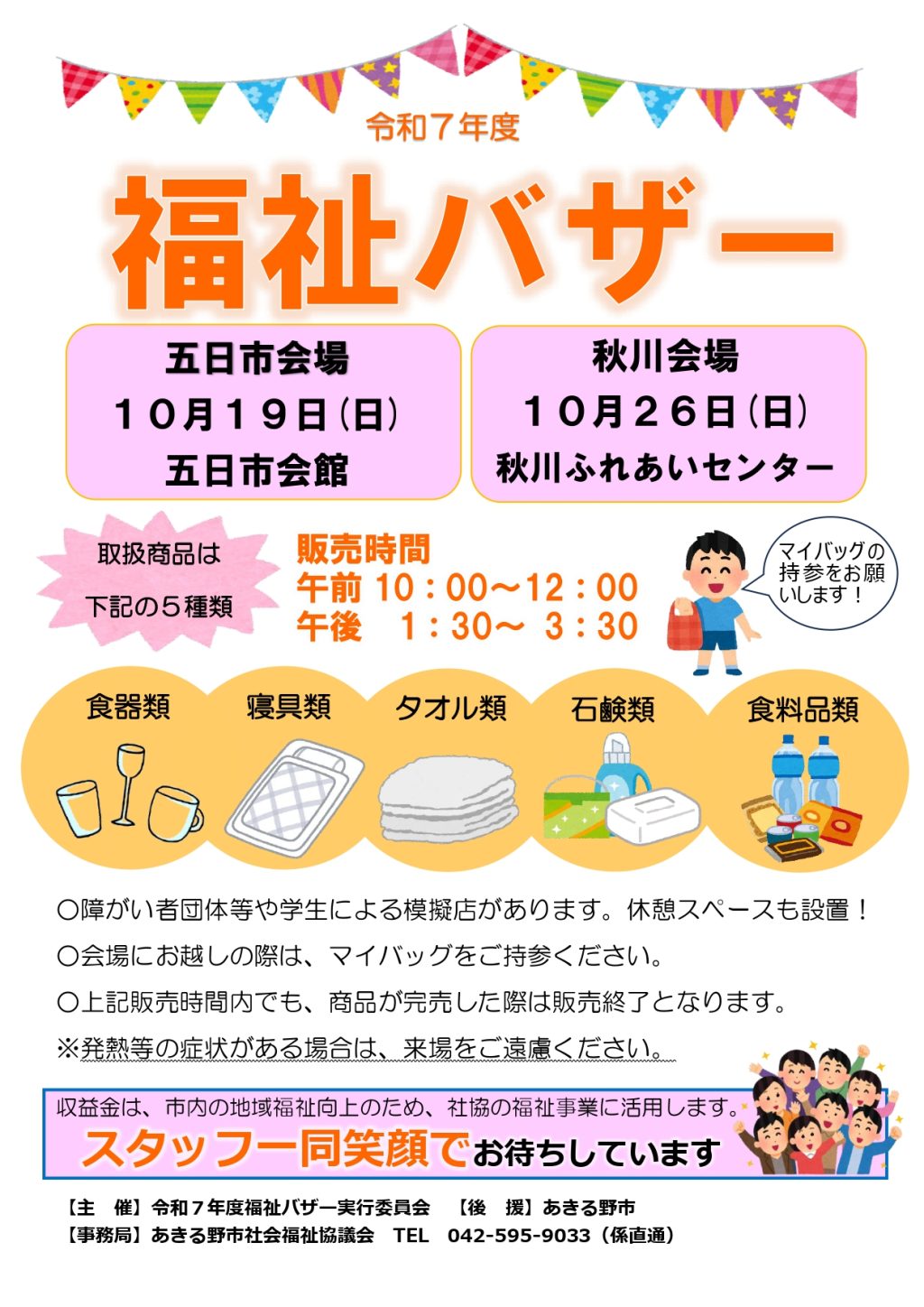 2025年10月08日 令和7年度福祉バザーを開催します 市民の幅広い協力を得て、物品の提供から販売までを行い、その収益金により地域福祉活動の充実を図るため、今年度も福祉バザー(五日市会場及び秋川会場)で実施します。多くの方々のご来場をお待ちしています。 一覧へ戻る