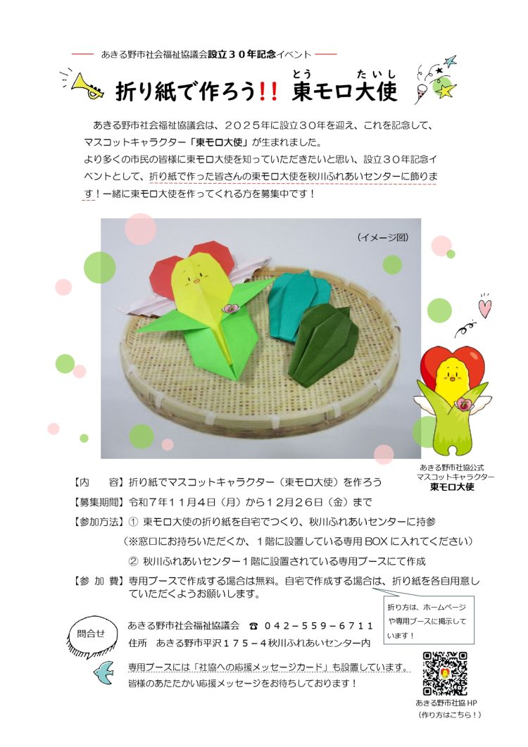 お知らせ イベント 2025年10月24日 【設立30年記念事業】折り紙で作ろう‼東モロ大使 本会が設立30年を迎えたことを記念して、マスコットキャラクター「東モロ大使」が誕生しました。より多くの市民の皆さまに東モロ大使を知っていただくため、設立30年記念事業として、折り紙で作った東モロ大使を秋川ふれあいセンターに装飾します。当イベントに参加して、一緒に東モロ大使を広げよう!!たくさんの東モロ大使をお待ちしています。 詳細は、チラシをご覧ください。 東モロ大使の折り方 一覧へ戻る