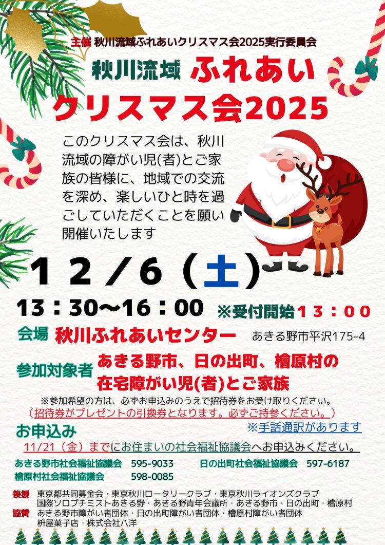 秋川流域の障がい児(者)同士やボランティア等との交流を図り、障がい児(者)の社会参加への一助とすることを目的に、秋川流域ふれあいクリスマス会2025を開催します。