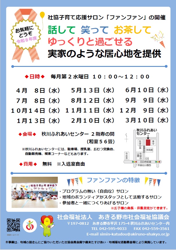 お知らせ 2026年03月16日 令和8年度最初の社協子育て応援サロン『ファンファン』開催日は令和8年4月8日(水)です 子育て中の親(祖父母、妊婦を含む)が集う、スタッフと参加者で一緒につくりあげるサロンです。入退室自由ですので、お気軽にお越しください。 子育て応援サロン「ファンファン」 一覧へ戻る